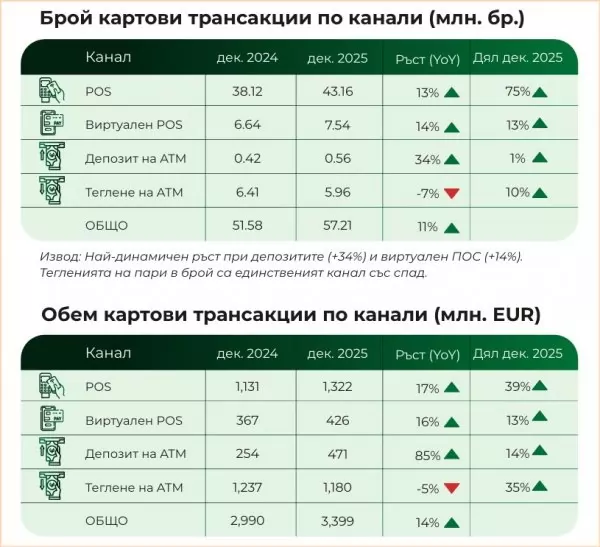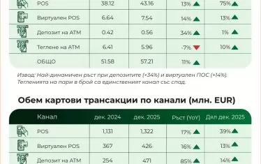 БОРИКА обръща внимание на важен феномен през декември, свързан с внасянето на кеш в банкомати. Депозирането на левове в банкомати е скочило с 34% като бройка и с цели 85% като обем - до 471 млн. евро. Така през последния месеца на 2025 г. делът на този тип трансакции е достигал 14% от общия обем, като е изпреварил онлайн плащанията.