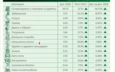 На предно място по годишен ръст на плащанията с карти (с 24%), са и развлеченията – концерти, заведения, кино и т.н..