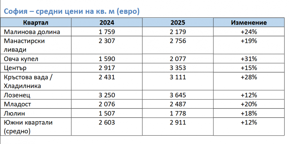 Агенциите за недвижими имоти отчитат около 15% ръст на средната цена на квадратен метър през 2025 г., което отново ни поставя сред водещите пазари в ЕС по растеж на цените на жилищата.