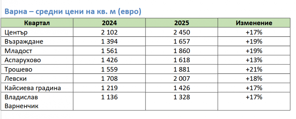 Със 17% средно се покачват цените във Варна за цялата 2025 г. Повишението, за разлика от столицата, е равномерно разпределено между типовете имоти. Най-популярни за клиентите остават кварталите "Изгрев", "Виница", "Владиславово", "Кайсиева градина", "Левски", "Чайка".