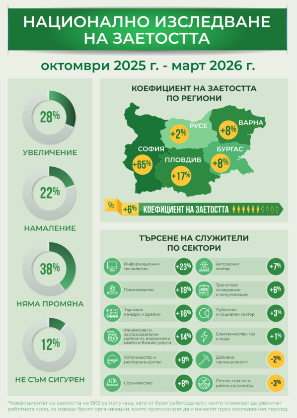 Проучването е проведено сред 1017 работодатели от 12 индустрии. Според него 28% от работодателите в България планират нови назначения през следващите шест месеца, докато други 22% ще прибегнат до съкращения. Така нетният коефициент на заетост е +6%, двойно повече от отчетените 3% при предното проучване през март 2025 г.