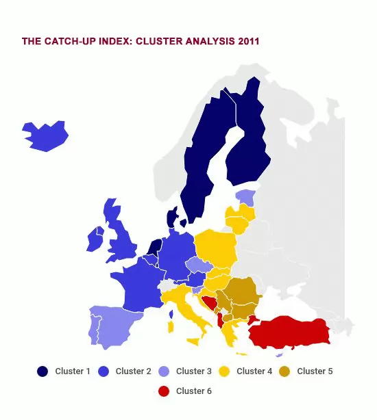 - Сравнението с 2011 г. показва, че като цяло новите страни членки на ЕС са успели да се „дипломират“ и да се прехвърлят в по-добре представящи се клъстери, като догонват редица стари страни-членки и оставят последните места за страните - кандидатки за ЕС в Югоизточна Европа. Този положителен процес обхваща и България и Румъния. Ако през 2011 година по цялостен резултат в Индекса на настигането България и Румъния са попадали в един клъстер със страни извън ЕС като Сърбия и Северна Македония, през 2019-а те вече са в по-горна група в компанията само на страничленки, сред които Гърция, Унгария и Хърватия.