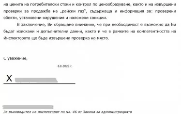 "От служебния министър на икономиката и индустрията Никола Стоянов е постъпил сигнал до Инспектората на минитерството на икономиката, че КЗП няма компетенциите да направи разследване за продажбата на райски газ, нито да следи цените и затова е поискал проверка на работата на комисията", заяви пред журналисти председателят на комисията Иван Френкев.
