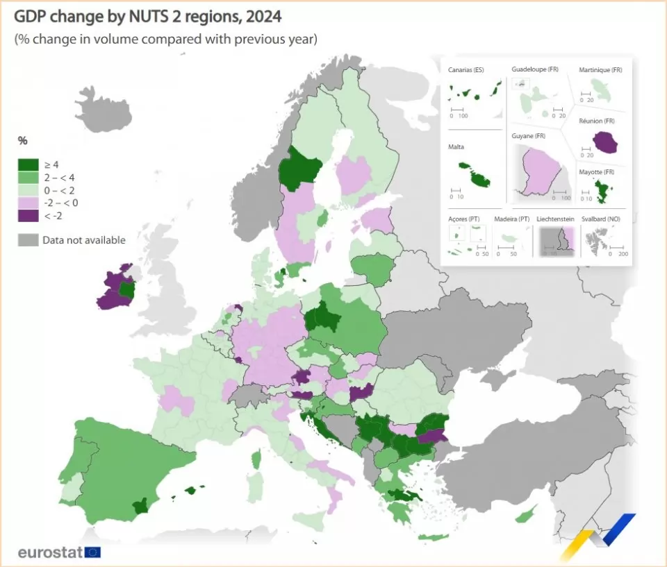 Българският шампион - Южен централен, който обхваща областите Пловдив, Пазарджик, Смолян, Кърджали и Хасково, е постигнал 11.6% ръст на икономиката през 2024 г. спрямо предната година. За сравнение, вторият в проучването на Евростат регион - Източна и Средна Ирландия, е отбелязал 8,5% увеличение на своя БВП. Третият в класирането, със съвсем близък резултат - 8.4% ръст, отново е български регион - Северен централен.