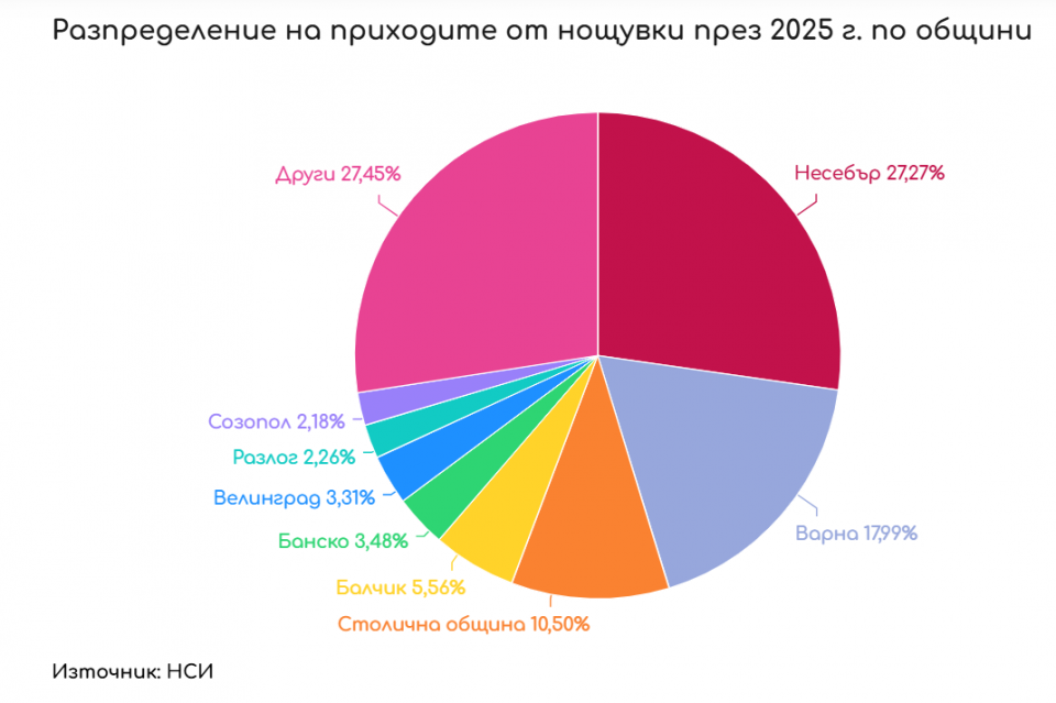 Несебър, Варна и София формират над 1/2 от тези приходи. Несебър например отчита 382 млн. евро, Варна - 252 млн, а столицата - 147 млн.
