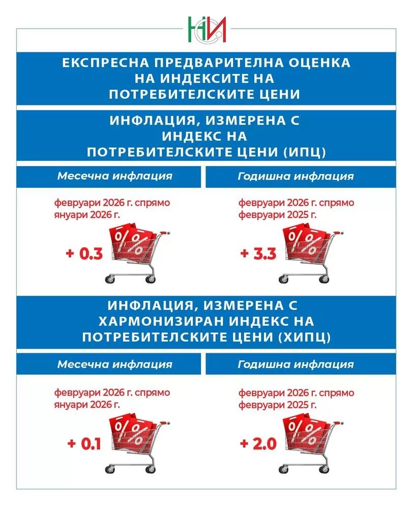 През февруари покачването на цените спрямо януари е 0.3%, а годишната инфлация се забавя до 3.3 процента. Това показва експресната предварителна оценка на Националния статистически институт (НСИ). Данните сочат известно отслабване на ценовия натиск в сравнение с януари.