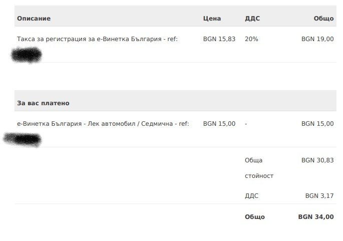 "Купувах набързо седмична винетка и не влязох предварително да проверявам какви са официално утвърдените цени. При закупуване получих две разписки, от които става ясно, че продавачът всъщност купува винетката на цена от 15 лв. от официален доставчик - Vinetki.bg, и начислява втори път такса от 19 лв. В разписката тази такса е представена като такса за регистрация на е-винетката", разказа потребител.