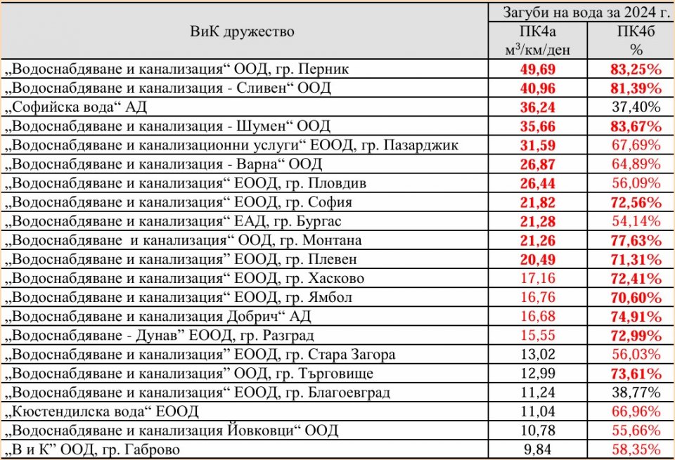 В цяла България има само два доставчика, които отчитат под 40% загуби. Това са "Софийска вода" (37.40) и ВиК Благоевград (38.77%).