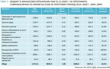 В края на втория 7-годишен програмен период България е усвоила едва 54% от средствата по европейските фондове, предоставени за преодоляване на значителното изоставане в икономическото ни развитие, лошото състоянието на инфраструктурата и на жизнения ни стандарт спрямо другите държави в ЕС. От определените за страната ни за 2014-2020 г. общо 9.9 млрд. евро по десет програми, към 31 декември 2020 г. са разплатени 6.360 млрд. евро. От тях 5.371 млрд. са идват от фондовете на Евросъюза, а останалата част - от държавния бюджет.