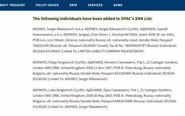 Министерството на финансите на САЩ е добавило бизнесмена Сергей Адониев, както и двамата му синове, в списъка на санкционираните лица, свързани с Русия. Запорирани са и две яхти на фамилията. От 2008 до 2019 г. Адониев е разполагал с български паспорт, издаден по процедура за „особени заслуги“, съобщава Аникорупционният фонд.