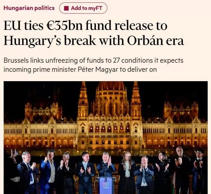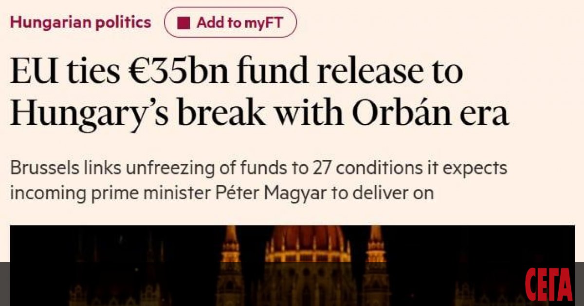 ЕС е поставил 27 условия на бъдещия министър-председател на Унгария в замяна на размразяването на 35 млрд. евро, съобщава Financial Times.