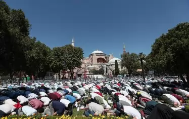Хиляди турци се събраха за първа молитва край "Света София", след като паметникът бе обявен от президента Ердоган за джамия. На церемонията, но вътре в храма, присъства и самият държавен глава. Датата за откриване на "Света София" като действаща джамия не е случайна - на днешния ден през 1923 г. е подписан Лозанският договор, ознаменувал победата на силите на Мустафа Кемал Ататюрк срещу чуждите войски в Турция и отменил унизителния за страната Севърски мирен договор.