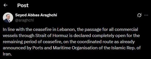 Иран обяви, че отваря Ормузкия проток. "В съответствие с прекратяването на огъня в Ливан, преминаването за всички търговски кораби през Ормузкия проток се обявява за напълно отворено за оставащия период на примирието по съгласувания маршрут, както вече беше обявено от Организацията за пристанища и морски транспорт на Ислямска република Иран", написа в "Х" иранският външен министър Абас Аракчи.
