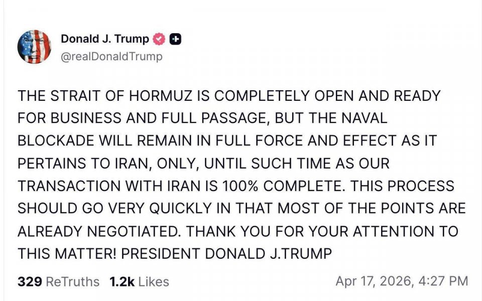 „Ормузкият проток е напълно отворен и готов за работа и пълноценно преминаване, но военноморската блокада ще остане в пълна сила и действие, тъй като се отнася само за Иран, докато нашата сделка с Иран не бъде завършена на 100%. Този процес трябва да премине много бързо, тъй като повечето точки вече са договорени“, написа президентът на САЩ.