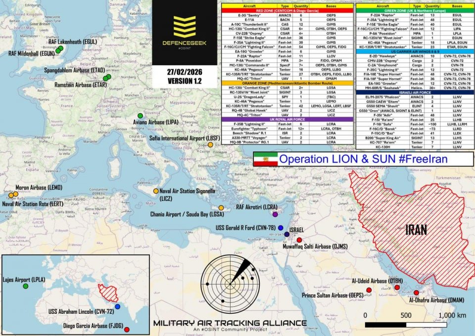Повече от 500 изтребители и до 200 самолета за поддръжка от САЩ и Израел са разположени в Близкия изток в подготовка за евентуален удар срещу Иран: