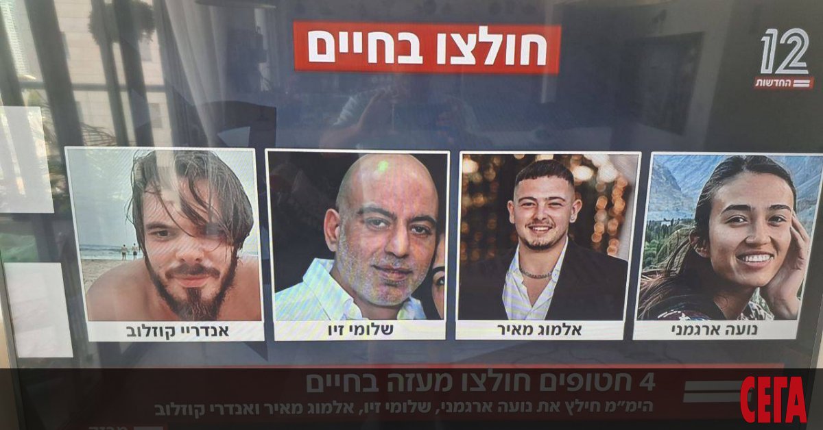 Според съобщението, при съвместната специална операция в събота сутринта са освободени Ноа Аргамани (25 г.), Алмог Меир Ян (21 г.), Андрей Козлов (27 г.) и Шломи Зив (40 г.), които са били отвлечени от терористичната организация "Хамас" по време на музикалния фестивал „Нова“ на 7 октомври. Козлов е гражданин на Русия.