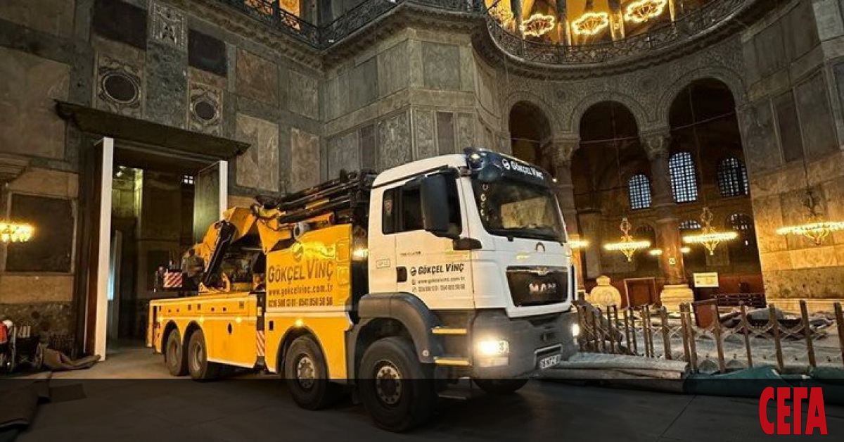 Духовници и реставратори от Турция изразяват безпокойство от начина на провеждане на реставрационните дейности в храма "Света София" в Истанбул, след като в социалните мрежи се разпространиха кадри, показващи камиони и кранове, паркирани вътре в историческата сграда, съобщи сайтът "Тюркийе тудей".