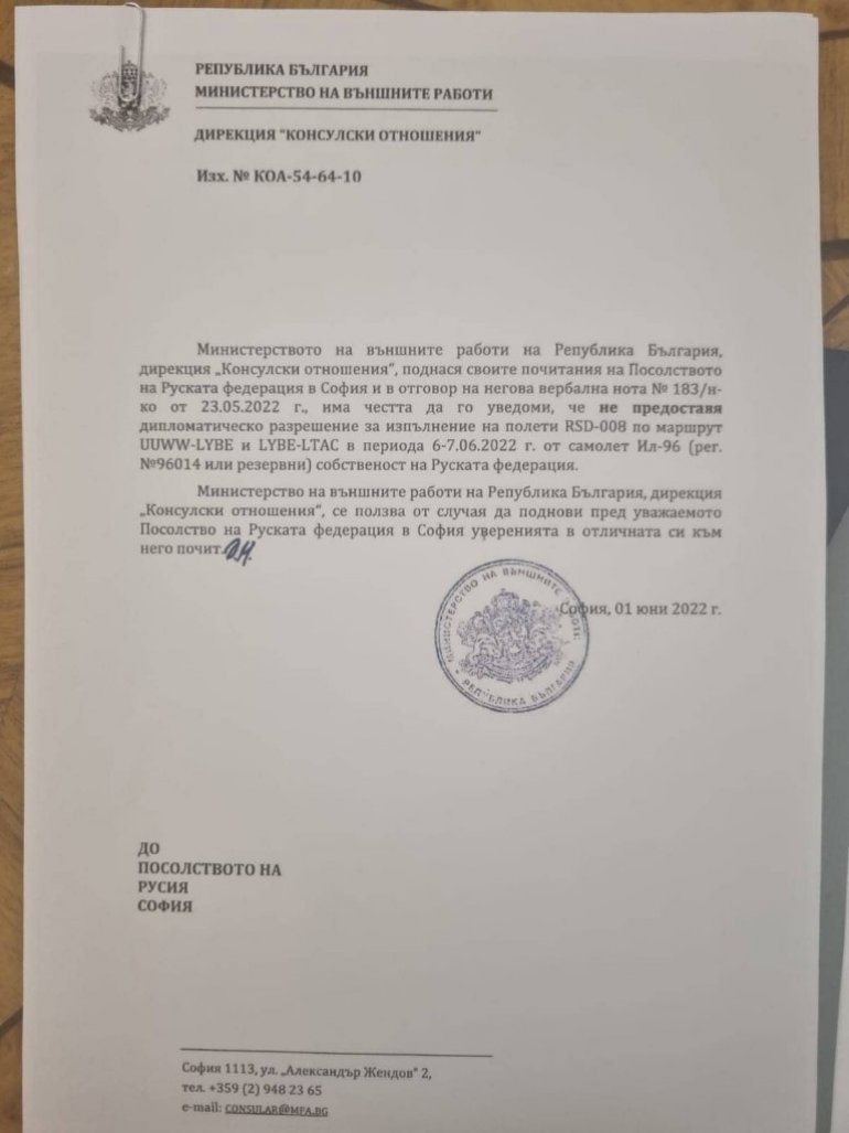 За затварянето на въздушното пространство на трите страни първо съобщи в неделя сръбският вестник "Вечерне новости", позовавайки се на собствен източник. "Министерството на външните работи с нота от 1 юни не предостави дипломатическо разрешение за изпълнение на руски полети над българска територия с министъра на външните работи на Руската федерация Сергей Лавров", обяви и българското МВнР днес. Решението е в съответствие със санкционните режими на Европейския съюз срещу Русия, обяснява министерството и допълва, че считано от 25 февруари 2022г., под номер 670 Сергей Викторович Лавров е включен в списъка с физически и юридически лица, обект на ограничителни мерки на ЕС, съгласно Регламент 269/2014 г.