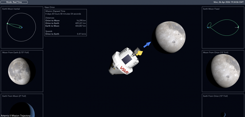 Капсулата "Орион" ще прелети покрай обратната страна на Луната тази нощ. Четиримата астронавти на борда са на 16 290 км от точката, в която капсулата ще започне да ускорява за да тръгне по обратния път към Земята. Скоростта на капсулата все още пада, очаква се тя да достигне до 0.42 км в секунда преди да започне гравитационното ускорение. НАСА предава 4K стрийм от полета.