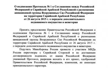 Президентът Владимир Путин възложи на министерствата на отбраната и на външните работи да проведат преговори със Сирия за разширяване на руските бази в страната, предава РИА Новости. Иска се придобиване на допълнителни недвижими имоти и пространства от акваториите. Разпореждането на Путин е публикувано на официалния портал за правна информация.