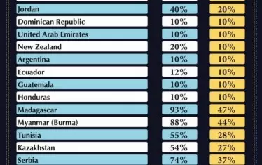 След това той показа табела с митата, които налагат съответните страни на американските стоки, и митата, които ще наложат САЩ. Китайските стоки ще бъдат обложени с 34 %, ЕС - 20%, Великобритания - 10%. За Китай до момента действаше 20 % мито и с новите тарифи облагането става 54 %. Според Bloomberg ще бъде обложена глобалната търговия в размер на 33 трилиона долара.