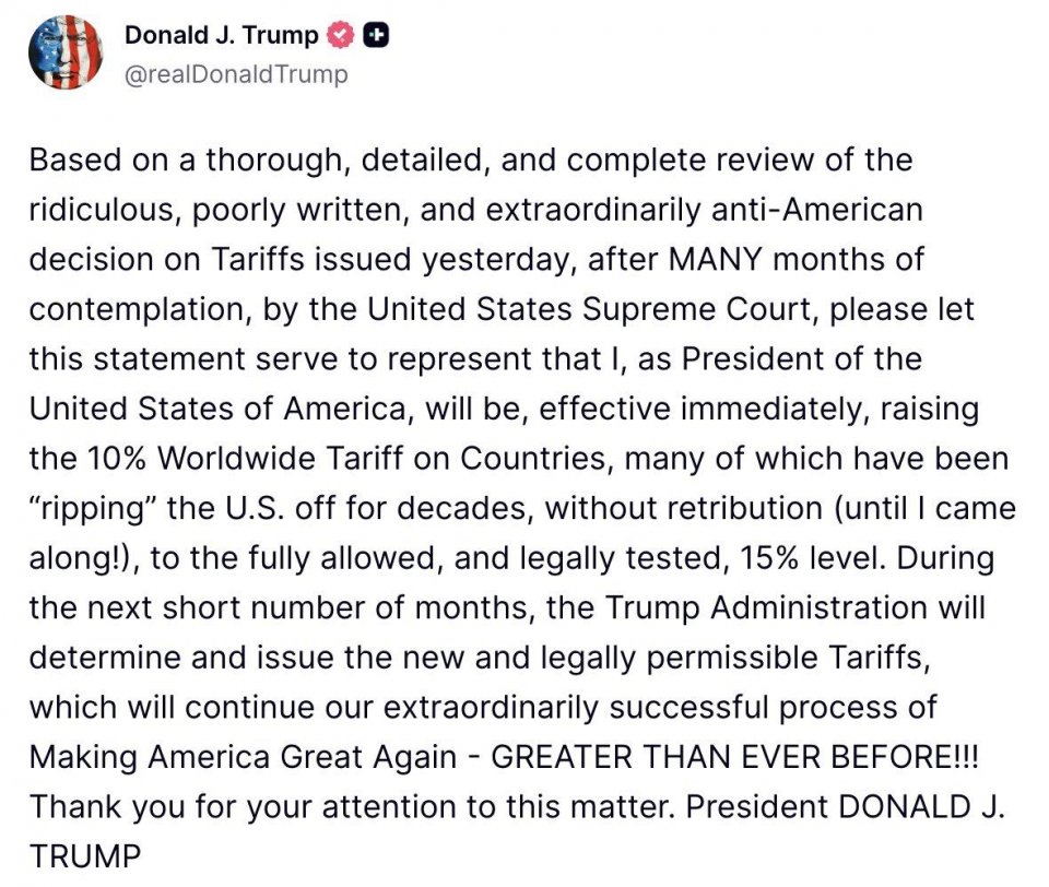 „Аз, като президент на Съединените американски щати, незабавно повишавам 10-процентното глобално мито за държавите, много от които десетилетия наред безнаказано "ограбваха" САЩ (докато не дойдох на власт!), до напълно разрешеното и юридически обосновано ниво от 15%“, написа президентът на САЩ в своята социална мрежа Truth Social.