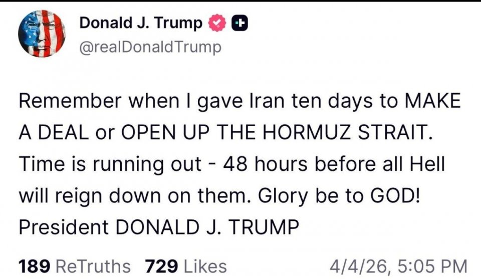 „Помнете, дадох на Иран десет дни да сключи сделка или да отвори Ормузкия пролив. Времето изтича - след 48 часа върху тях ще се стовари целият ад“, написа той в социалната си мрежа.