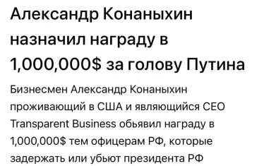 Живеещият в САЩ руски бизнесмен Александър Конанихин обеща да даде 1 млн. долара на този, който убие Владимир Путин