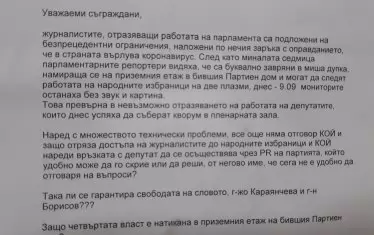 „Наред с множеството технически проблеми, все още няма отговор КОЙ и защо отряза достъпа на журналистите до народните избранници и КОЙ нареди връзката с депутат да се осъществява чрез PR на партията, който удобно може да го скрие или да реши, от негово име, че сега не е удобно да отговаря на въпроси?“, пише в текста към петицията, внесена от журналиста Владимир Христовски.