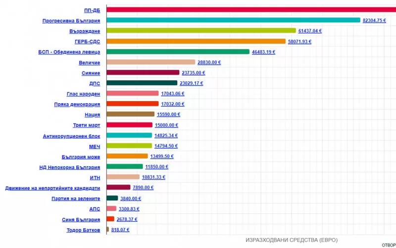 Най-много разходи са направили отново от Продължаваме Промяната – Демократична България – 111 006 евро. Следва ги вече коалицията на доскорошния президент Румен Радев – Прогресивна България със 82 305 евро, което е над два пъти увеличение спрямо предишните десет дни, но коалицията пък е и сред най-бързо набиращата дарения в тази кампания. На трето място са от Възраждане – с 61 437 евро. АПС, "Синя България" и независимият кандидат за парламента Тодор Батков са в дъното на класацията.