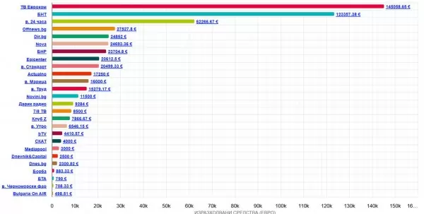 Второто място е за обществената БНТ – 123 357 евро, в които се включват и част от медийните пакети. Тарифите на БНТ и БНР се определят от Министерски съвет и традиционно са по-ниски от пазарните, което се отразява и на привлечените от двете медии суми. БНТ също така предоставя редица безплатни форми, в които зрителите могат да се запознаят с възгледите на голям брой кандидати. На трета позиция по обем привлечени средства е вестник "24 часа" с 62 267 евро.