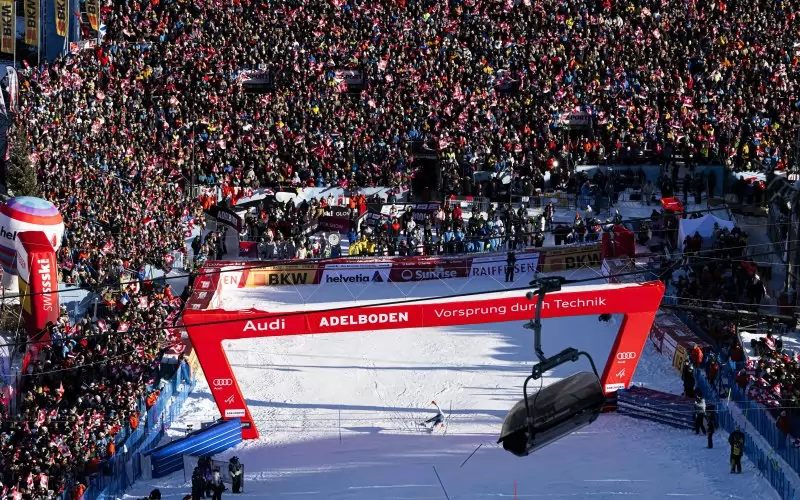 Алберт Попов пресича финалната линия на трасето в Аделбоден пред препълнените трибуни в швейцарския зимен център.
