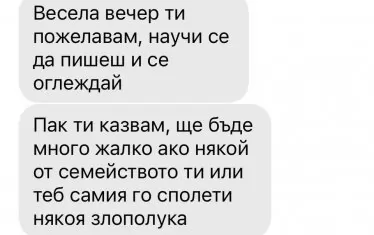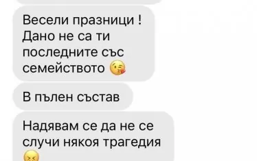 "Весели празници! Дано не са ти последните със семейството", "Надявам се да не се случи някоя трагедия", "Но ти обещавам, че ще идвам да ти нося цветя на гроба", "Весела вечер ти пожелавам, научи се да пишеш и се оглеждай", "Пак ти казвам, ще бъде много жалко ако някой от семейството ти или теб самия го сполети някоя злополука", "Пазете се", "Дано успеят да те топлят когато си заминат най-близките ти", "Дано воскресат всички около теб" и т.н. Това са само част от съобщенията, които Антъни Иванов изпраща до Георги Аврамчев около 21:00 ч. в празничната вечер и в обедните часове на следващия ден.