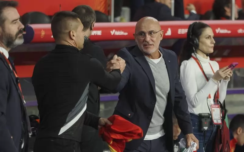 Новият селекционер на представителния отбор на България Александър Димитров (вляво) се поздравява с испанския треньор Луис де ла Фуенте преди началото на световната квалификация във Валядолид. В първите две срещи за българския наставник на поста "лъвовете" понесоха две поражения с обща голова разлика 1:10.