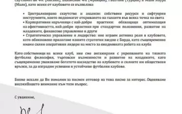 В него се предлага формирането на официални преговорни екипи от двете страни. От страна на "Левски" в процеса ще участват упълномощен представител на клуба и адвокат на дружеството. "Целта на първата работна среща е да бъдат уточнени общата рамка на преговорите, очакванията на двете страни и следващите стъпки", обясниха от "Левски".