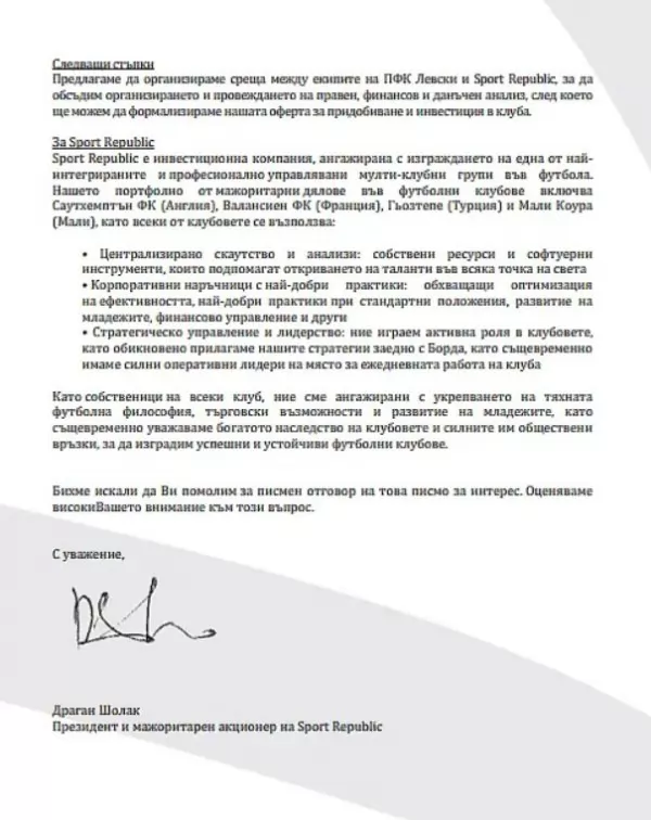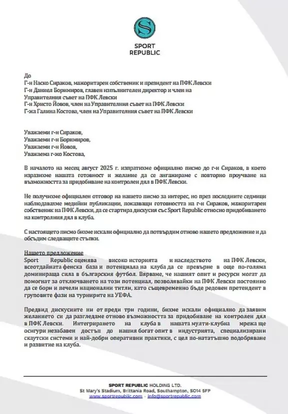 Компанията Sport Republic потвърди интереса си за купуването на контролния пакет акции на "Левски" и има готовност да започне преговори. Това съобщи ръководството на футболния клуб, като приложи официалното писмо, изпратено от международната компания и подписано от нейния президент и мажоритарен акционер Драган Шолак.