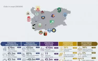 Според данните на УЕФА 94% от стадионите у нас са държавни или общински. За последното десетилетие са направени инвестиции в общо 9 проекта за обновяване на съоръженията. Само 6% от спонсорите на фланелките на българските отбори пък са чуждестранни фирми.