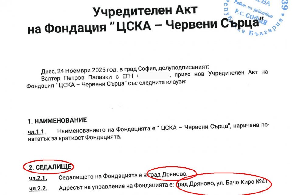 Фондацията всъщност е учредена преди по-малко от месец - на 24 ноември. А седалището ѝ е в Дряново, на ул."Бачо Киро" (виж снимката).