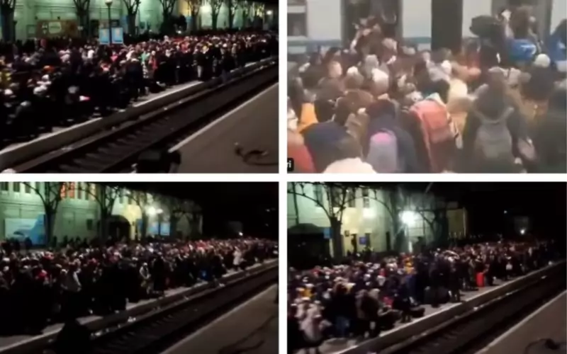 Шокиращи кадри от железопътната гара в Лвов, важен град в Западна Украйна, близо до граница с Полша, се разпространяват в социалните мрежи. На тях се виждат хиляди хора, струпали се на перона, които се опитват да се качат на влаковете за съседната държава.