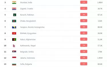 Първото място на планетата по мръсен въздух тази сутрин държи пакистанският град Лахор (индекс 306), а в Топ 3 са два индийски мегаполиса - Делхи (182) и Мумбай (174).