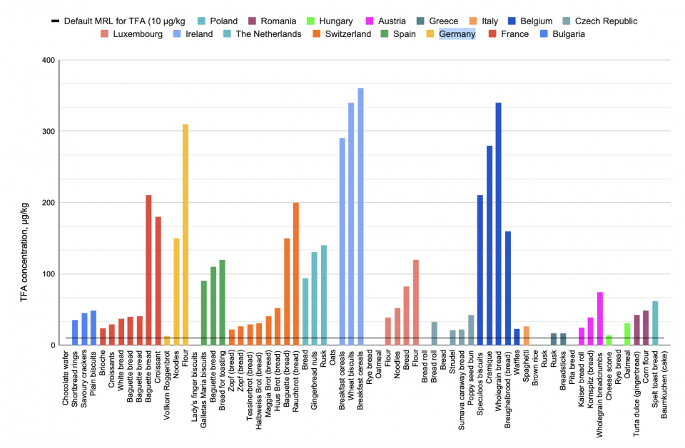 Резултатите са от проучване на мрежата за противодействие на пестицидите в Европа PAN, в което са включени продукти и от България. В него са включени 65 конвенционални зърнени храни, закупени в 16 европейски държави – първото проучване от този вид на ниво ЕС. Предишни доклади са установили високи нива на TFA във виното и известно замърсяване на чешмяната вода. Той е разтворим във вода, което означава, че може да бъде усвоен от растенията от почвата.