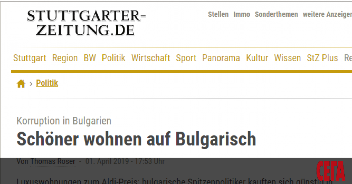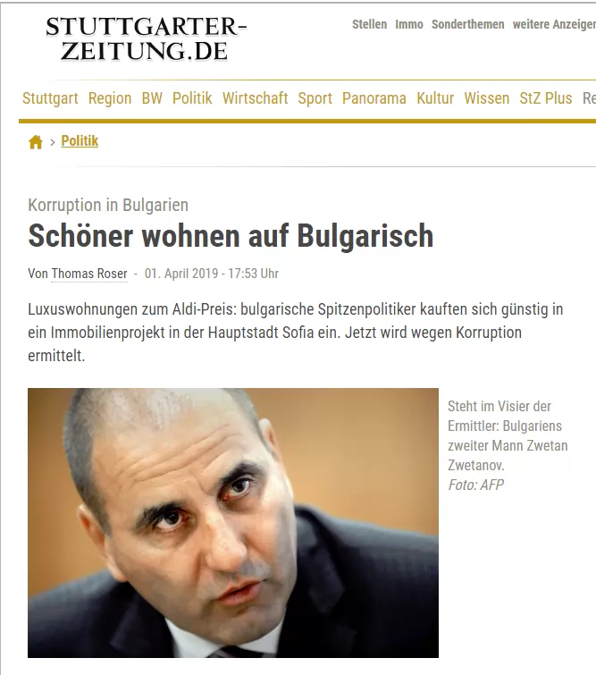 Под това заглавие "Щутгартер цайтунг" stuttgarter-zeitung.de съобщава за имотния скандал, свързан с апартаментите на Цветан Цветанов. Авторът Томас Розер пише, че "ключови български политици си купуват имоти на цените на Алди (евтина верига супермаркети) и сега ги разследват за корупция".