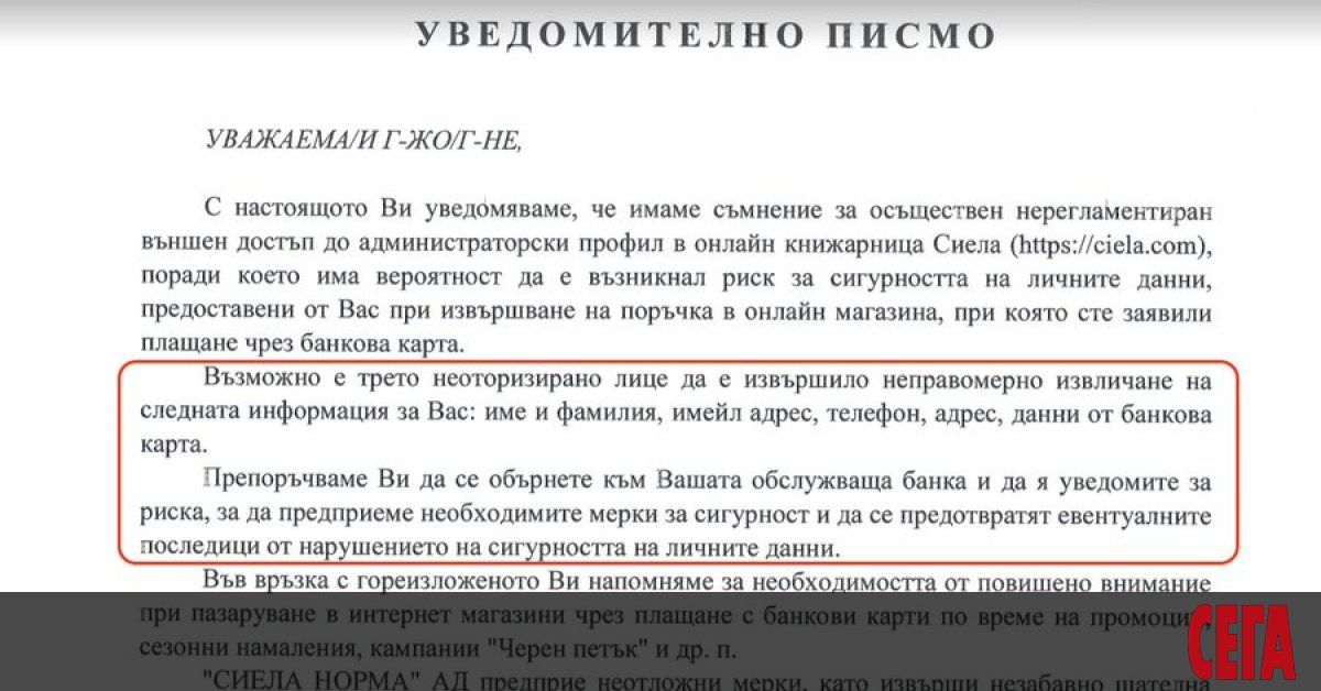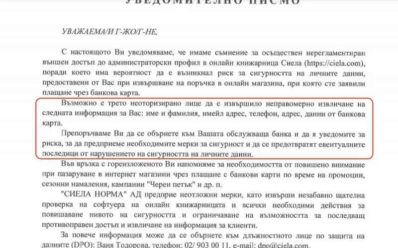 В него се казва, че е възможно трето, неоторизирано лице, да е получило достъп до лични данни и чувствителна информация за клиентите като име, адрес, имейл, банкова сметка. Затова клиентите трябва да уведомят банката си за риска и да предприемат съответните мерки да не се стигне до неприятни последици. Писмото завършва с уверението, че "Сиела" е предприела допълнителни мерки за сигурност