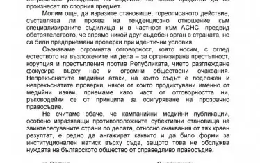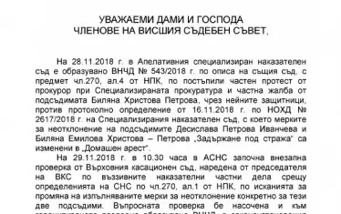 "Молим ви да изразите становище правомерно и допустимо ли е да се нарежда проверка включваща и неприключило производство, без никакви данни и посочване на каквито и да е фактически основания за отклонения в разписаните правила за организацията на дейността на съдебния орган, и съставлява ли това опит за оказване на влияние върху вътрешното убеждение на съдиите, на които предстои да се произнесат по спорния предмет", пишат спецсъдиите. Те искат и становище дали Панов няма тенденциозно отношение към специализираните съдилища, тъй като подобна проверка не е нареждана за никой друг съд.